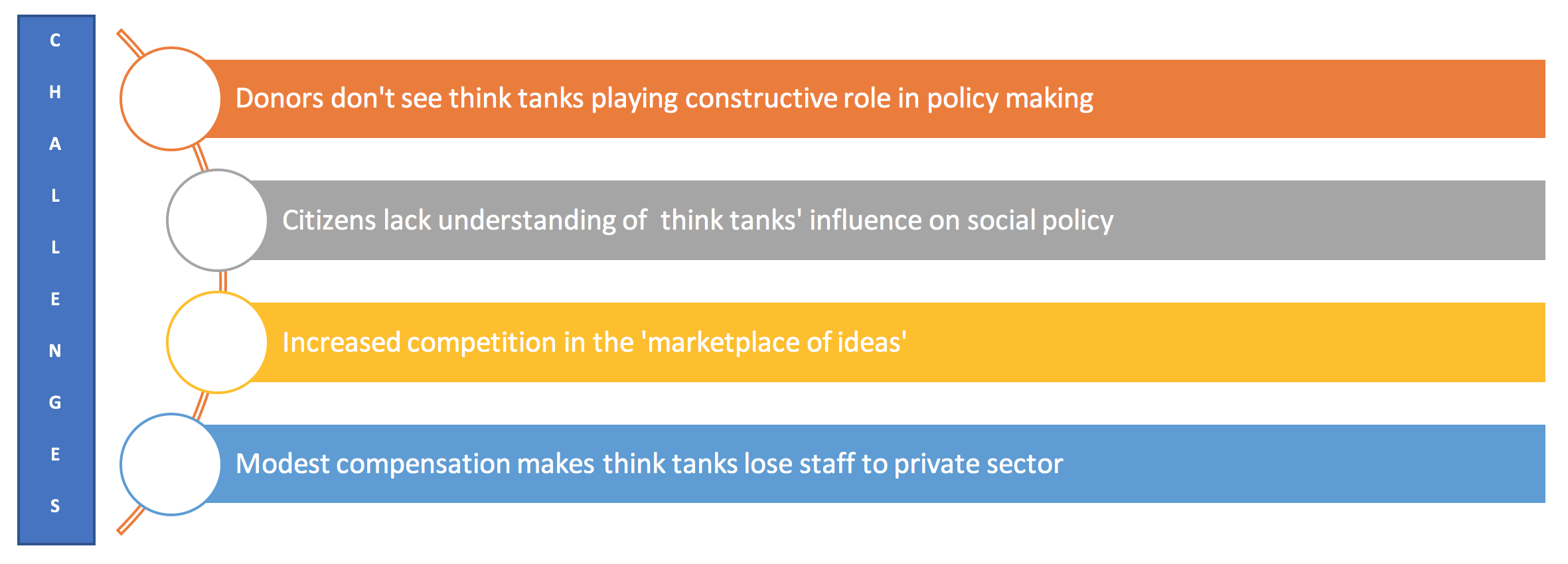Funding challenges apart, Canadian think tanks, much like their US counterparts, are facing increased competition in the “marketplace of ideas.” Large banks and management consultancy firms are increasingly developing their thought leadership capabilities, thereby encroaching on the think tanks’ area of expertise. This is a major challenge for think tanks. For one, the banks and consulting firms have considerably more resources than think tanks, in terms of finances, personnel and visibility. Second, “private” thought leadership is not usually bound by donors or grants, meaning that their output is very flexible in terms of messaging, scope of peer review, timelines, etc. And finally, the Canadian think tanks often compensate their staff at levels well below salaries in the private sector. This means that there will almost certainly be a “brain drain” of staff from the think tanks to these large players.