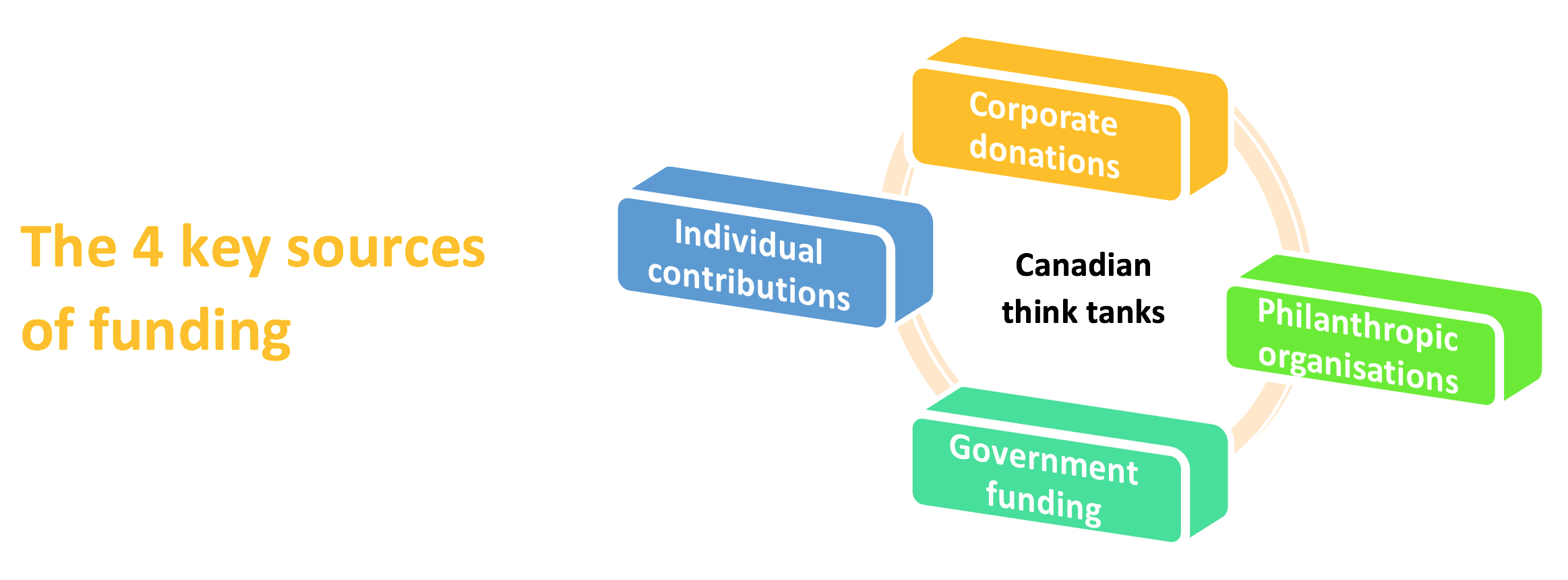 Christopher Rastrick: Many Canadian think tanks pursue a diversified funding model instead of relying on a single donor or endowment for their operational activities. They primarily rely on three principal funding sources: philanthropic organisations, corporate donations and individual contributions. There’s, of course, usually a disproportionate degree of funding from one constituency over another.