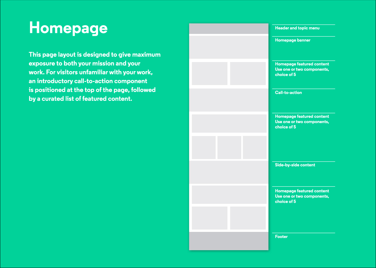 - What page templates and components will we arrange the content into? For example, a topic landing page might pull through listings information about publications, events and people associated with that topic, but it will often also have its own title, blurb and often curated highlights.