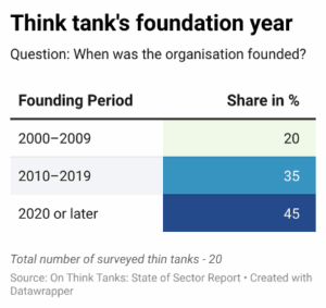 All 20 organisations surveyed were founded after 2000. Nearly half of those appeared within the last five years. Many newer institutions were created by civic leaders, academic networks, or through international partnerships, demonstrating a gradual but steady growth of non-state-affiliated policy research in the region.