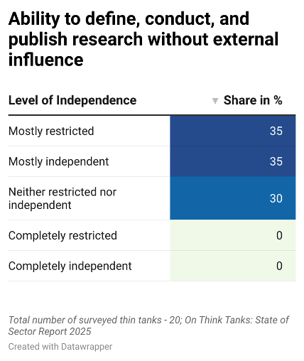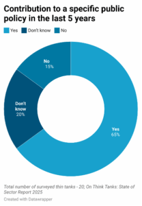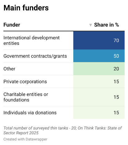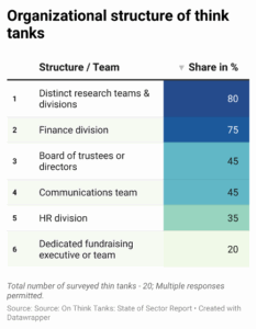 Structurally, these think tanks remain lean but relatively well organised: four out of five have dedicated research teams, and three-quarters maintain finance divisions. But less than half have formal boards or dedicated communications units, and only a minority have HR departments (35%) or fundraising specialists (20%). This points to a reasonably solid internal backbone, but underdeveloped capacities in governance, outreach, and resource mobilisation are also notable features.