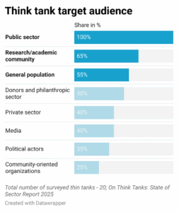 The public sector remains the primary audience for all think tanks, though access to key decision-makers is not always guaranteed. To broaden their influence, many cultivate relationships with universities and academic networks (65%) and target the general population (55%). Donor engagement also features prominently, with half of think tanks maintaining links to philanthropic or development organisations. Engagement with the private sector (40%), media professionals (40%), or political actors (35%) is less consistent.