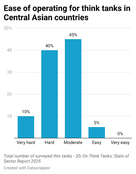 The operating environment for think tanks in Central Asian countries remains demanding, though experiences vary between the sector as a whole and individual organisations. At the sector level, half of the respondents describe conditions as hard or very hard (50%), with nearly as many finding them moderately challenging (45%) and only a small minority considering them easy (5%).