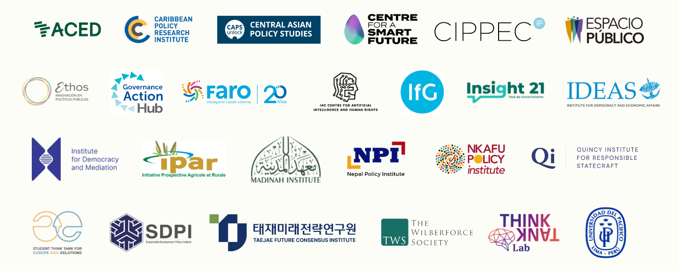ACED (Benin), CAPRI (Jamaica), CAPS Unlock (Kazakhstan), Centre for a Smart Future / Colombo Urban Lab (Sri Lanka), Centro de Investigación de la Universidad del Pacífico (Peru), CIPPEC (Argentina), Espacio Público (Chile), Ethos (Mexico), Grupo FARO (Ecuador), IDEAS Malaysia (Malaysia), IDM Albania (Albania), Innovation Center for Artificial Intelligence and Human Rights (Pakistan), Insight 21, Universidad Siglo XXI (Argentina), Institute for Government (UK), IPAR (Senegal), Madinah Institute (Saudi Arabia), Nepal Policy Institute (Nepal), Nkafu Policy Institute (Cameroon), Quincy Institute (USA), Results for Development / Governance Action Hub (USA), SDPI (Pakistan), STEAR (Belgium), Taejae Future Consensus Institute (South Korea), The Wilberforce Society (UK), Think Tank Lab (Germany)