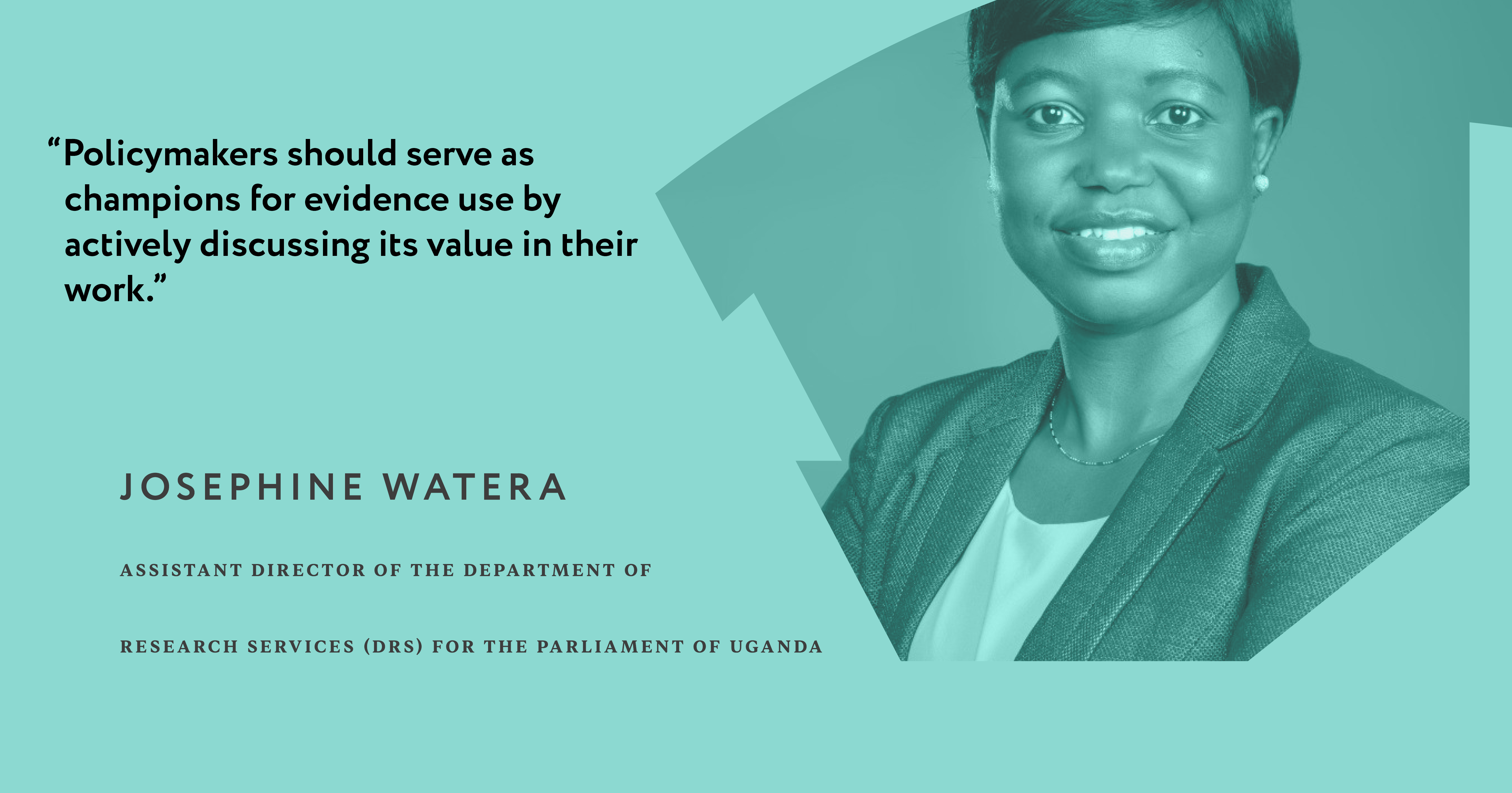 In this conversation, AEN and OTT talk to Josephine Watera, Assistant Director of the Department of Research Services (DRS) for the Parliament of Uganda. Prior to this, she was head of the Monitoring and Evaluation Division in the Ugandan parliament. Josephine is also the recipient of the Africa Evidence Leadership Award 2023 in the Evidence User category offered by the Africa Evidence Network.