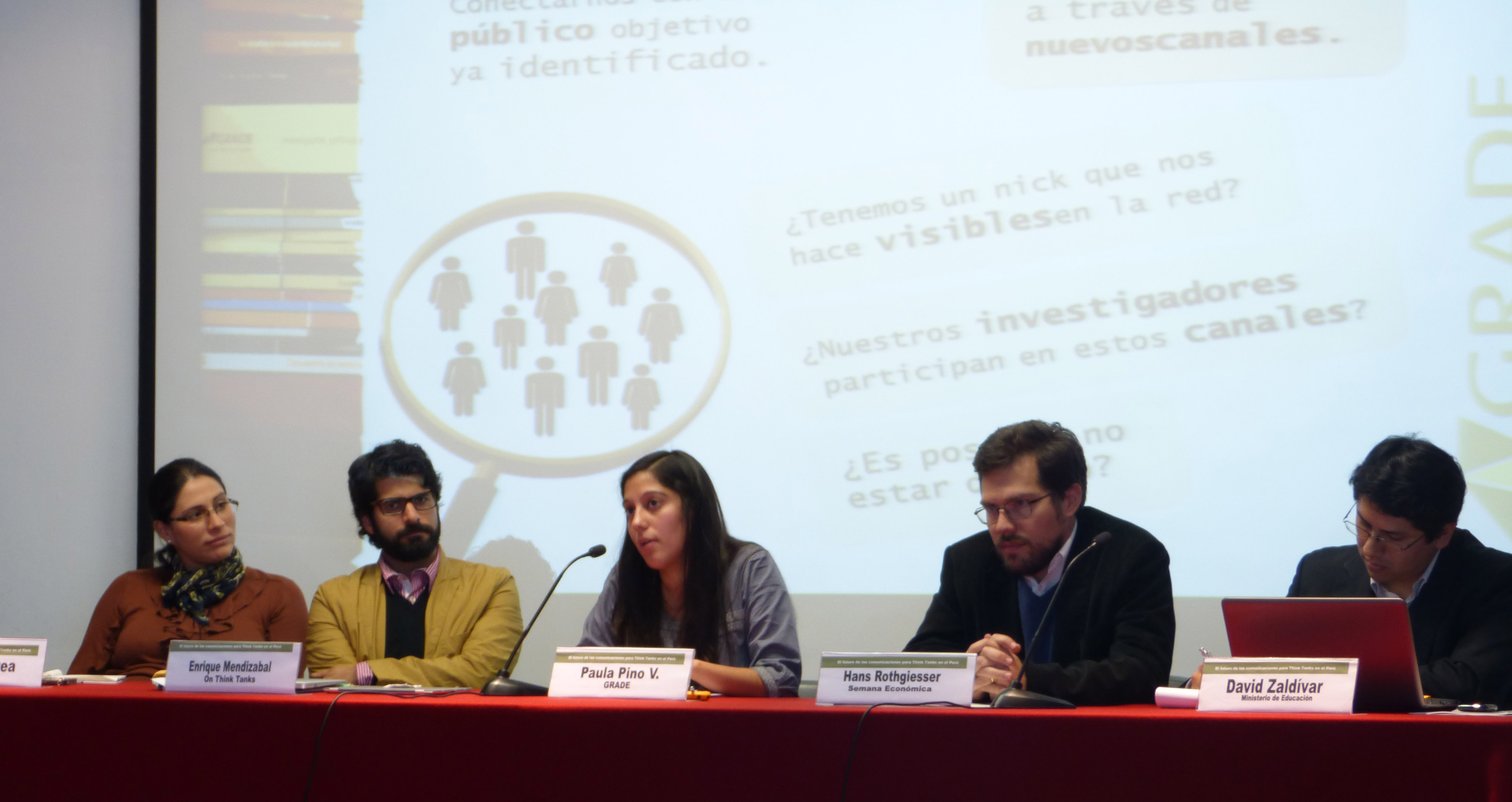 On Monday 12th August, On Think Tanks and GRADE, a think tank based in Lima, held the first conference on the future of think tank communications in Latin America. The panelists were Enrique Mendizabal, of On Think Tanks; Paula Pino, a communicator at GRADE; Hans Rothgiesser, head online editor at SEMANA Economica; and David Zaldivar, online communications specialist at the Ministry of Education. The conference was moderated by Norma Correa. This conference was inspired by a similar event held in London last April organised by a group of communicators, and which has resulted in a blog, WonkComms.