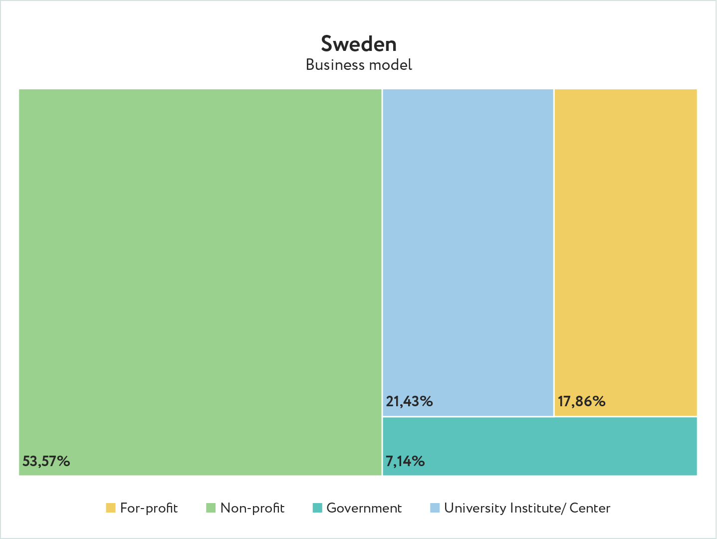 - Business models: Non-profit (53.57%), university institute/centre (21.42%) & for-profit (17.85%)