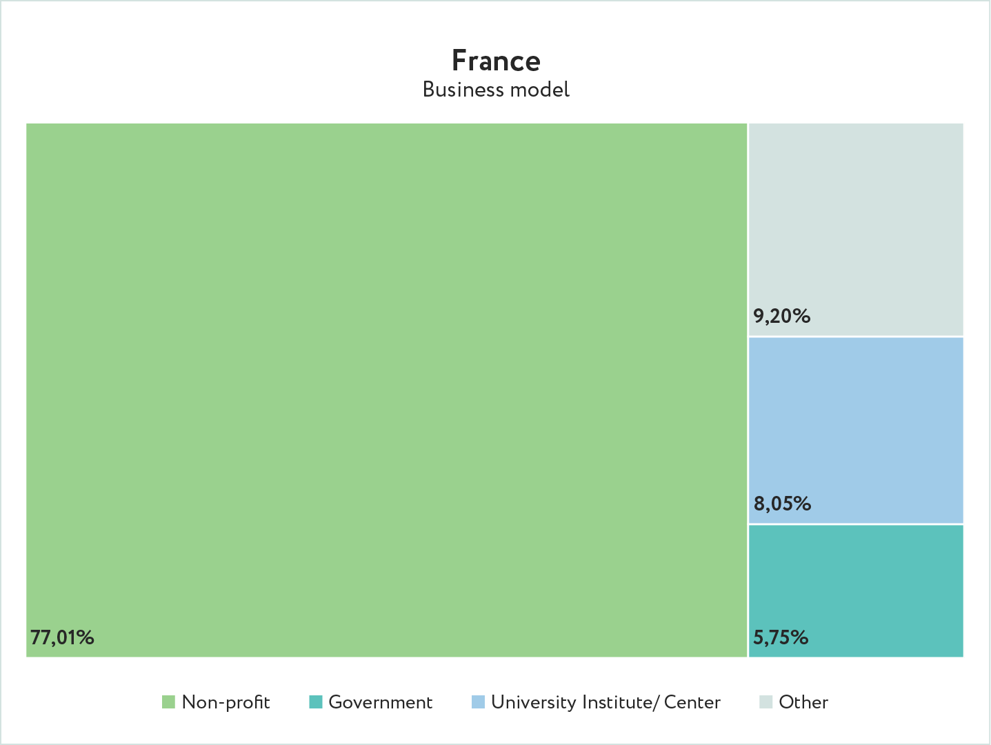 - Business models: Non-profit (66.33%), university institute/centre (6.93%) & government (4.95%)