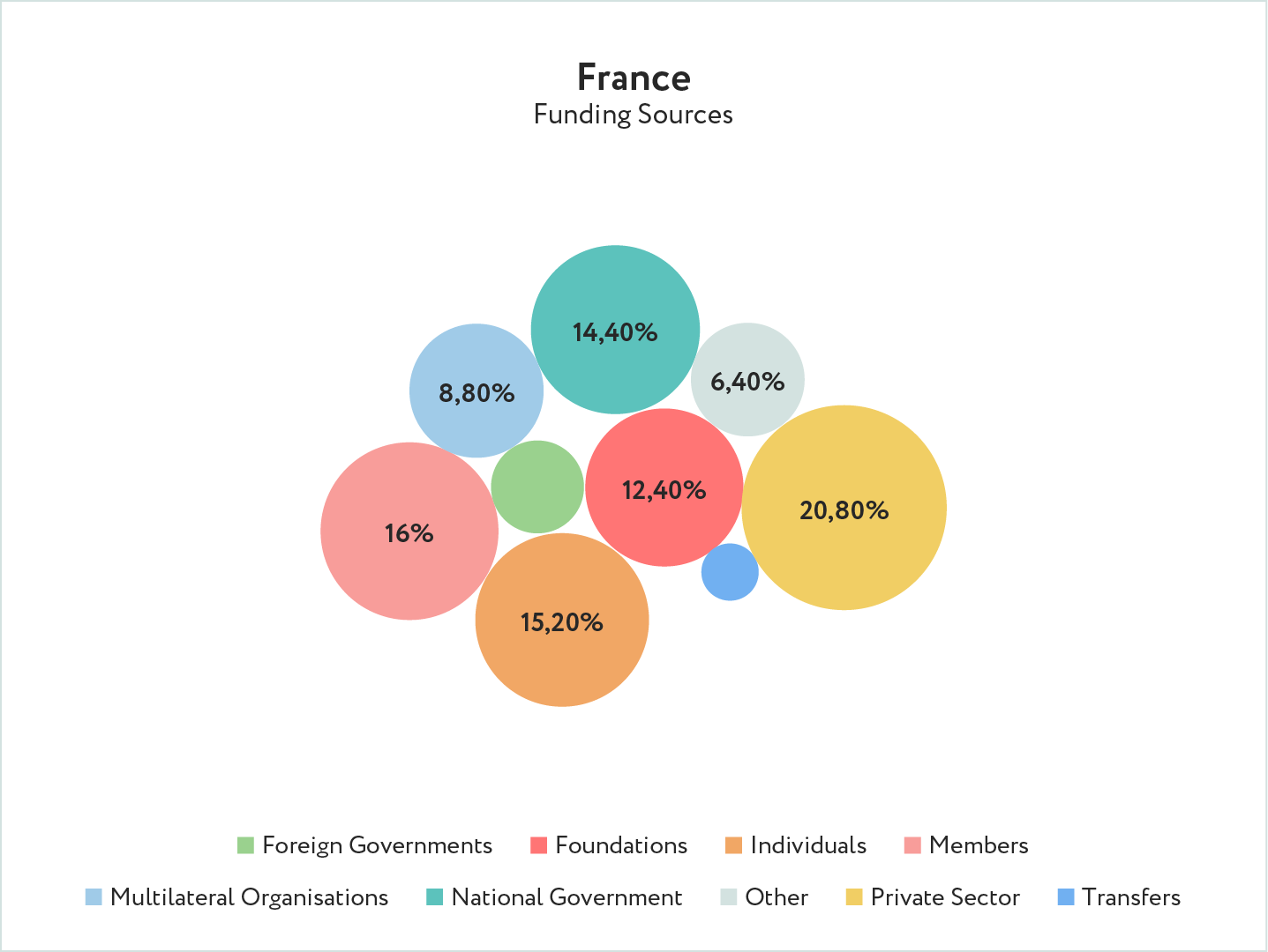 In France, there are six principal sources of think tank funding: the state, territorial authorities, European funding, individual donors, foundations and, increasingly, private companies. The following visual illustrates the diversity in funding sources of think tanks in France. The Other (6.4%) bubble likely includes EU funding.