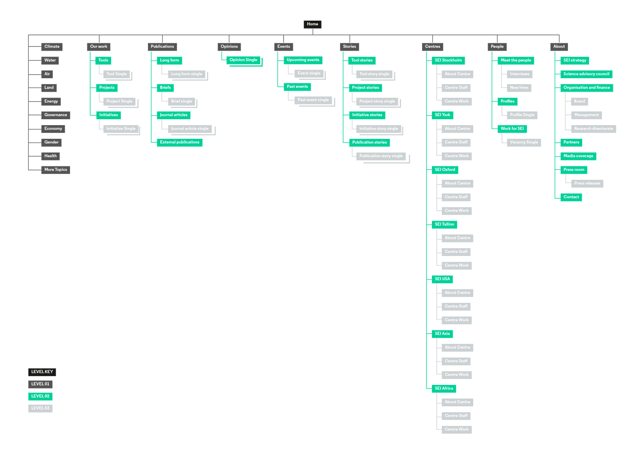 For SEI, we started with an audit of the existing site and then compared this to our strategic brief to see how it could be improved. Broadly, when we try to organise a think tank’s online content we are interested in four things:
