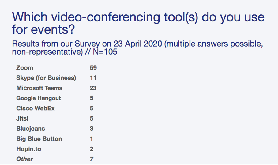 In mid-April, during a web event in our #DigitalThinkTanking series, we surveyed thinktankers on which video-conferencing tools their think tank uses for online events. This is what we found: