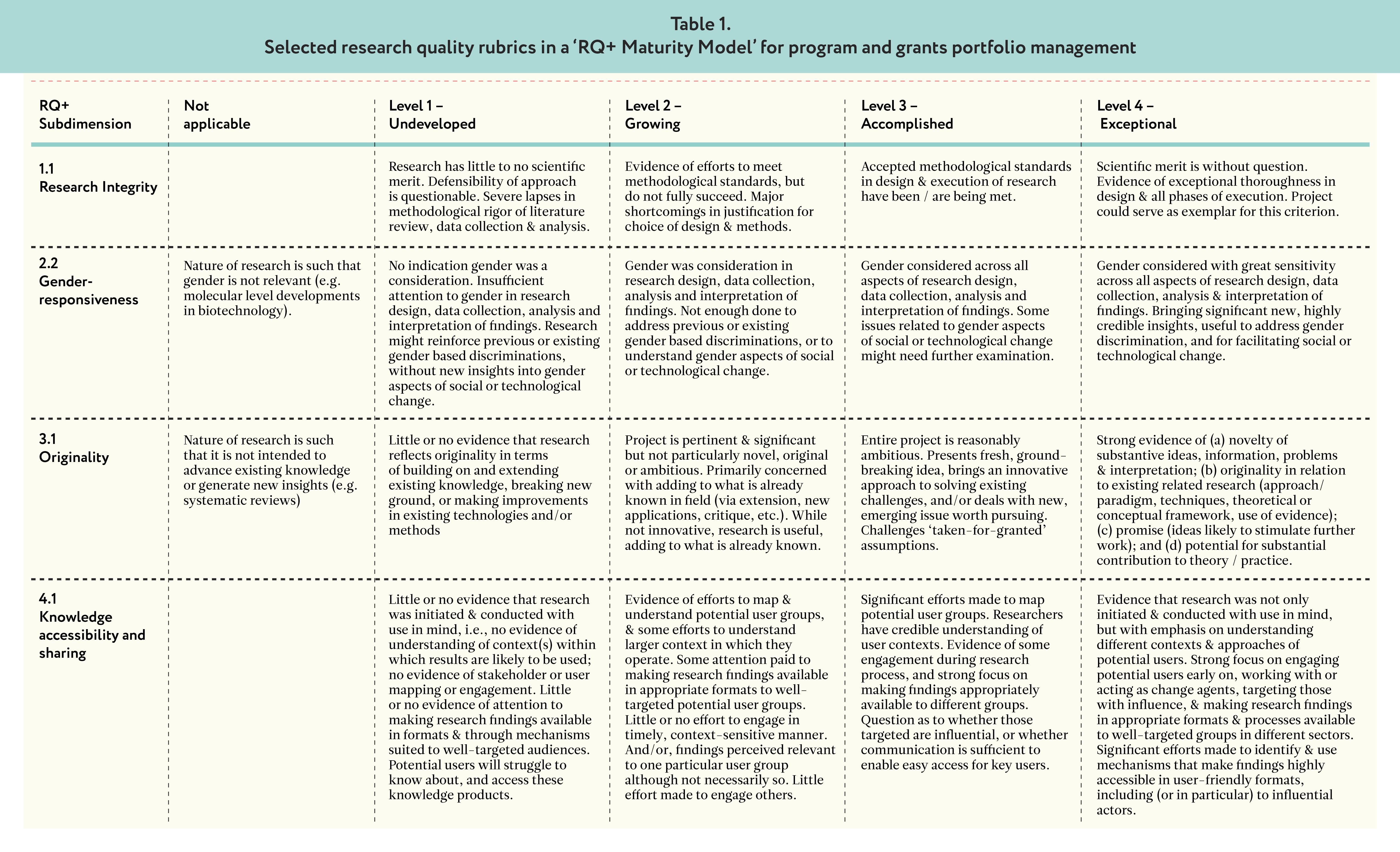 First, managers, staff, grantees and other partners can cultivate a shared understanding of, and common approach to research quality if they focus on the quality dimensions and sub-dimensions during the conceptualization or management of research interventions or portfolios. The RQ+ approach enables them to identify and articulate the values and principles underlying their research and its management. It also supports target setting and the development of milestones for tracking progress.