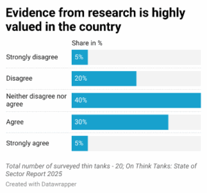 Structurally, these think tanks remain lean but relatively well organised: four out of five have dedicated research teams, and three-quarters maintain finance divisions. But less than half have formal boards or dedicated communications units, and only a minority have HR departments (35%) or fundraising specialists (20%). This points to a reasonably solid internal backbone, but underdeveloped capacities in governance, outreach, and resource mobilisation are also notable features.