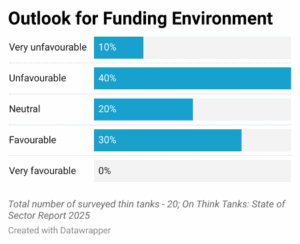 When reflecting on their own organisation’s experience over the past year, more respondents rate conditions as moderate (55%), fewer report significant difficulties (35%), and a handful find operations relatively smooth (10%). This suggests that while structural barriers are broadly felt, some think tanks are better equipped to manage them.
