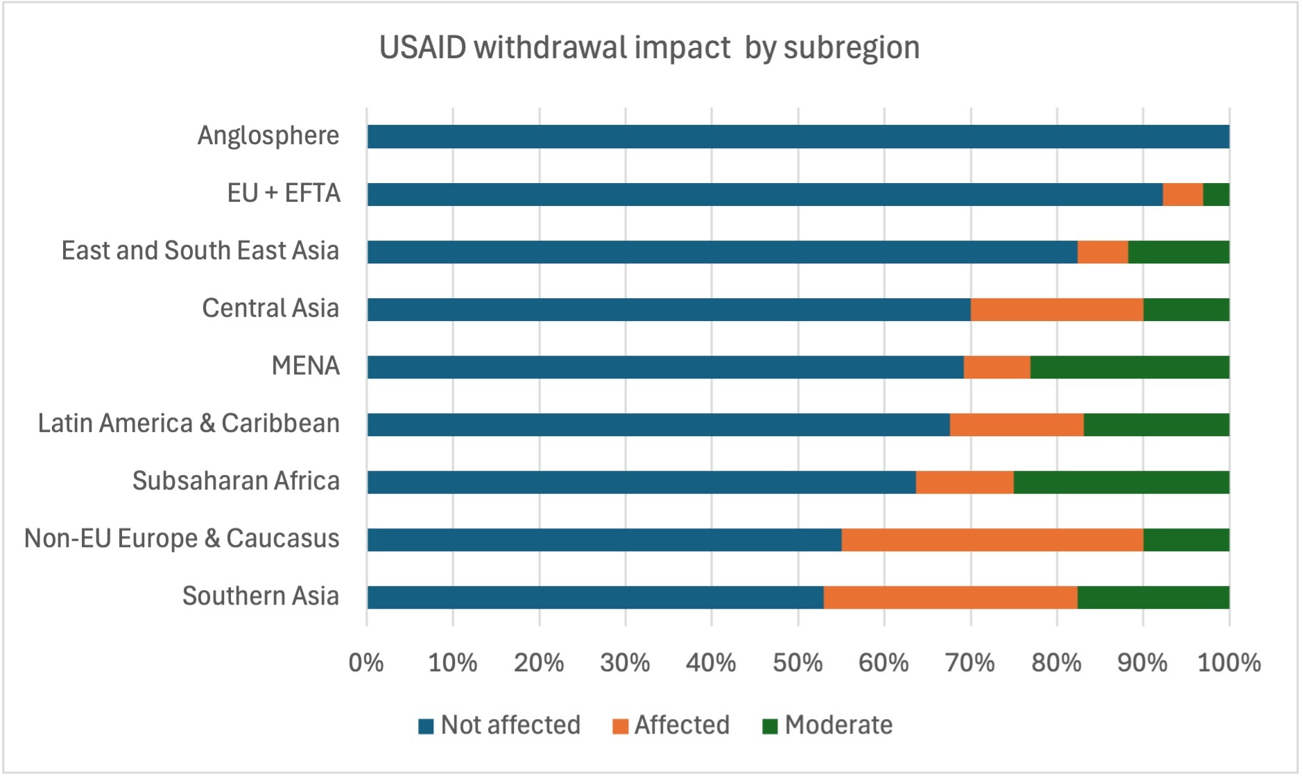 Interestingly, the share of an organisation’s budget coming from a single donor does not show a statistically significant relationship with the level of impact reported. At first glance, it might be expected that highly donor-dependent think tanks would be the most vulnerable to USAID’s exit. Indeed, organisations that relied heavily on one funder did report stronger effects, especially those indicating they were “very much” affected. But these differences were not robust enough to be statistically confirmed.