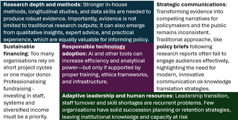 The survey and field experience point to a set of core institutional deficits that limit think tanks’ long-term impact:
