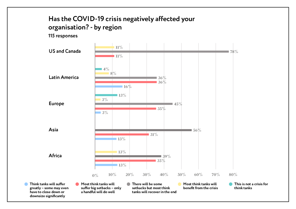 The picture seems gloomier in the global South: 52% of Latin American thinktankers consider that the crisis will have a significant effect on think tanks in their country; 48% from Africa, 44% from Asia, 38% from Europe, and only 11% from the US and Canada thought the same.
