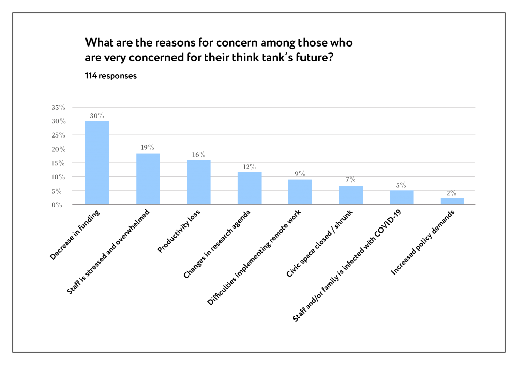 Only a small proportion of respondents, 4%, reported being included in their governments’ stimulus packages and policies – although this may have improved since the survey closed. Still, think tanks who expressed the most concern about their future were those who were not included in any direct or indirect support package.