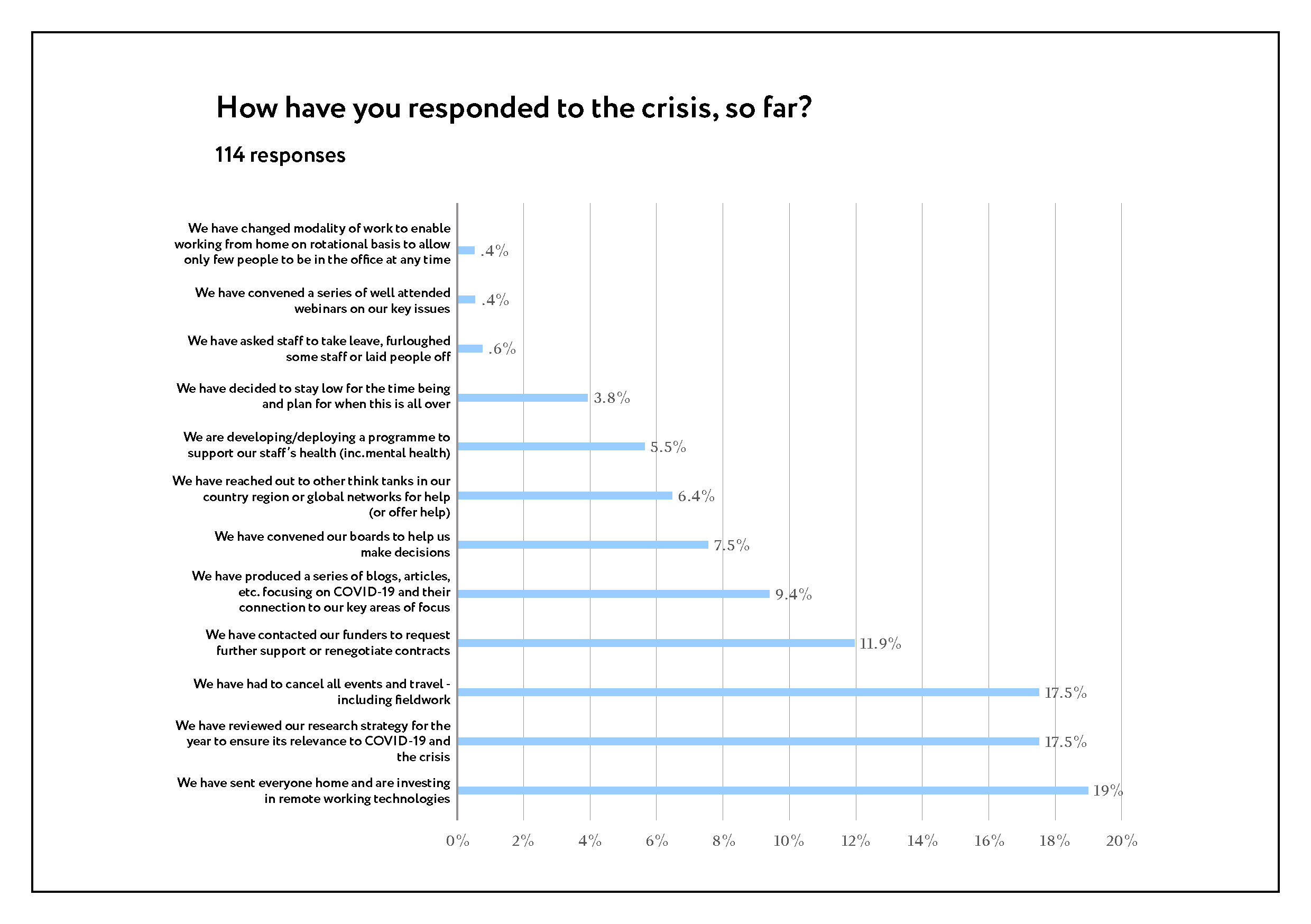 From sending staff home to re-assessing their research and communications plans, to contacting their funders and reaching out to their boards, think tanks are trying a range of strategies to deal with the crisis.